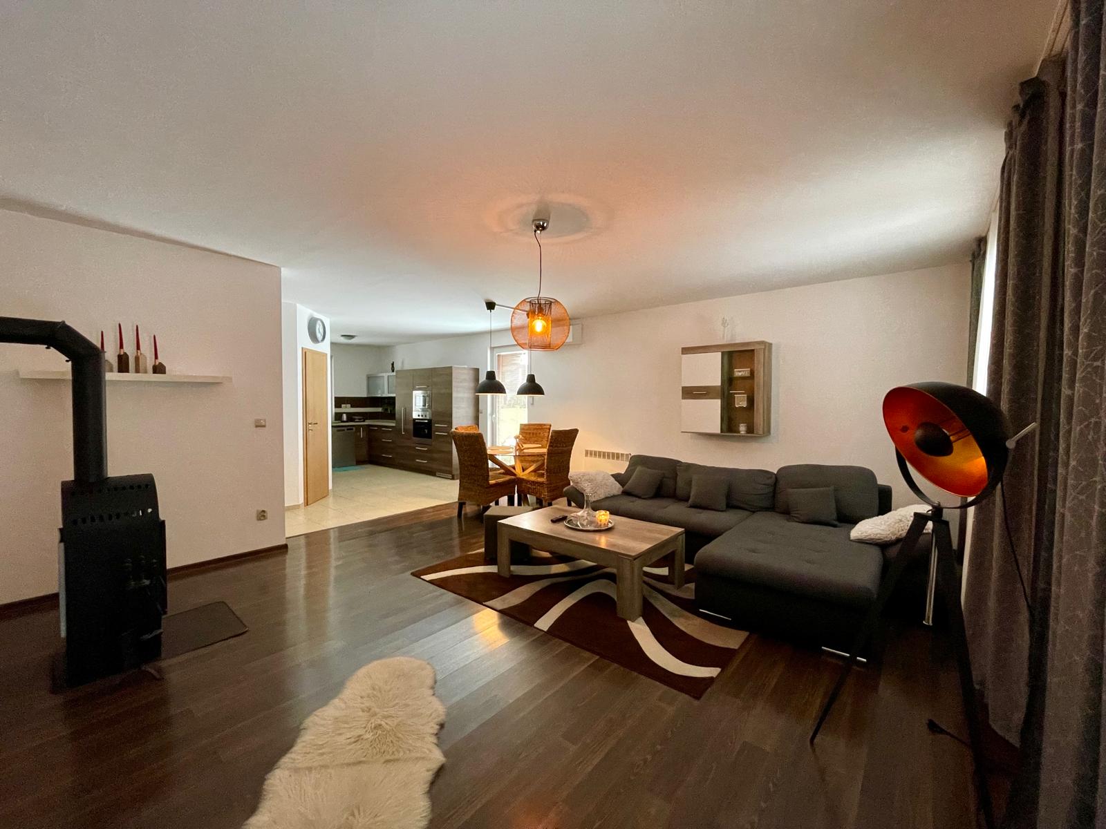 - Veľká kuchyňa prepojená s jedálňou a obývačkou s kachľami