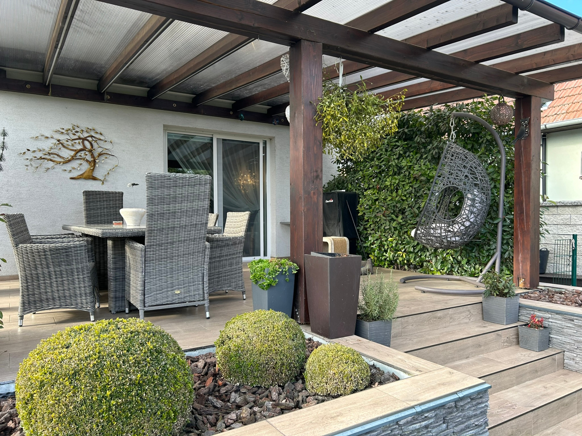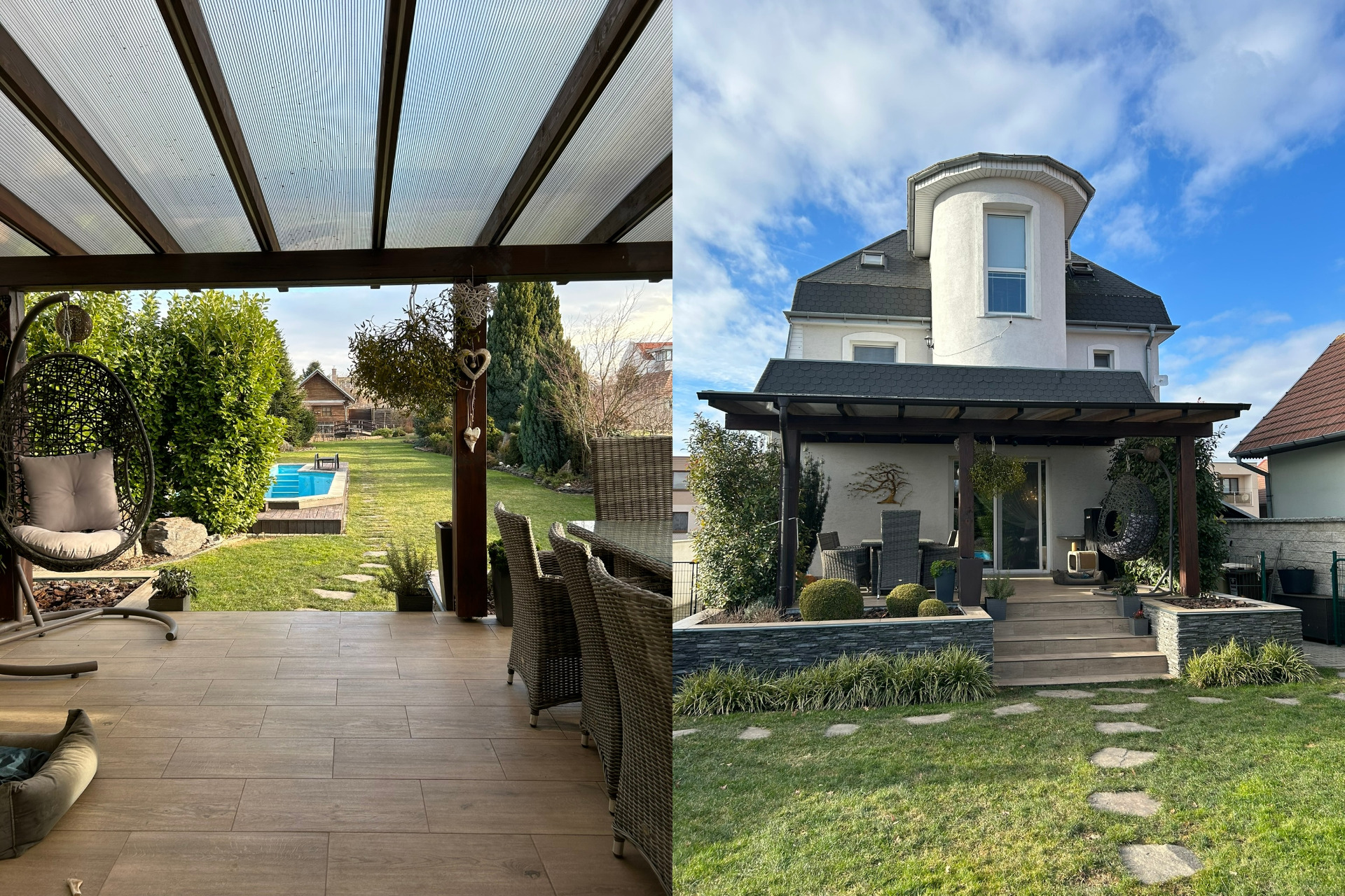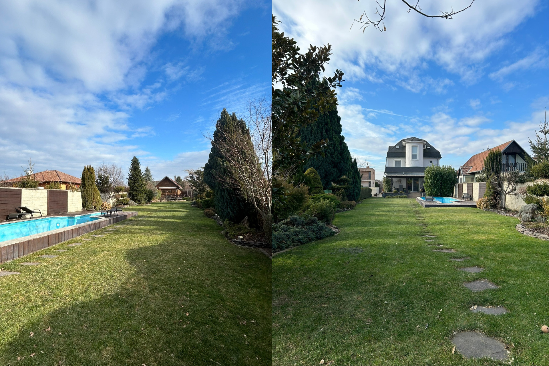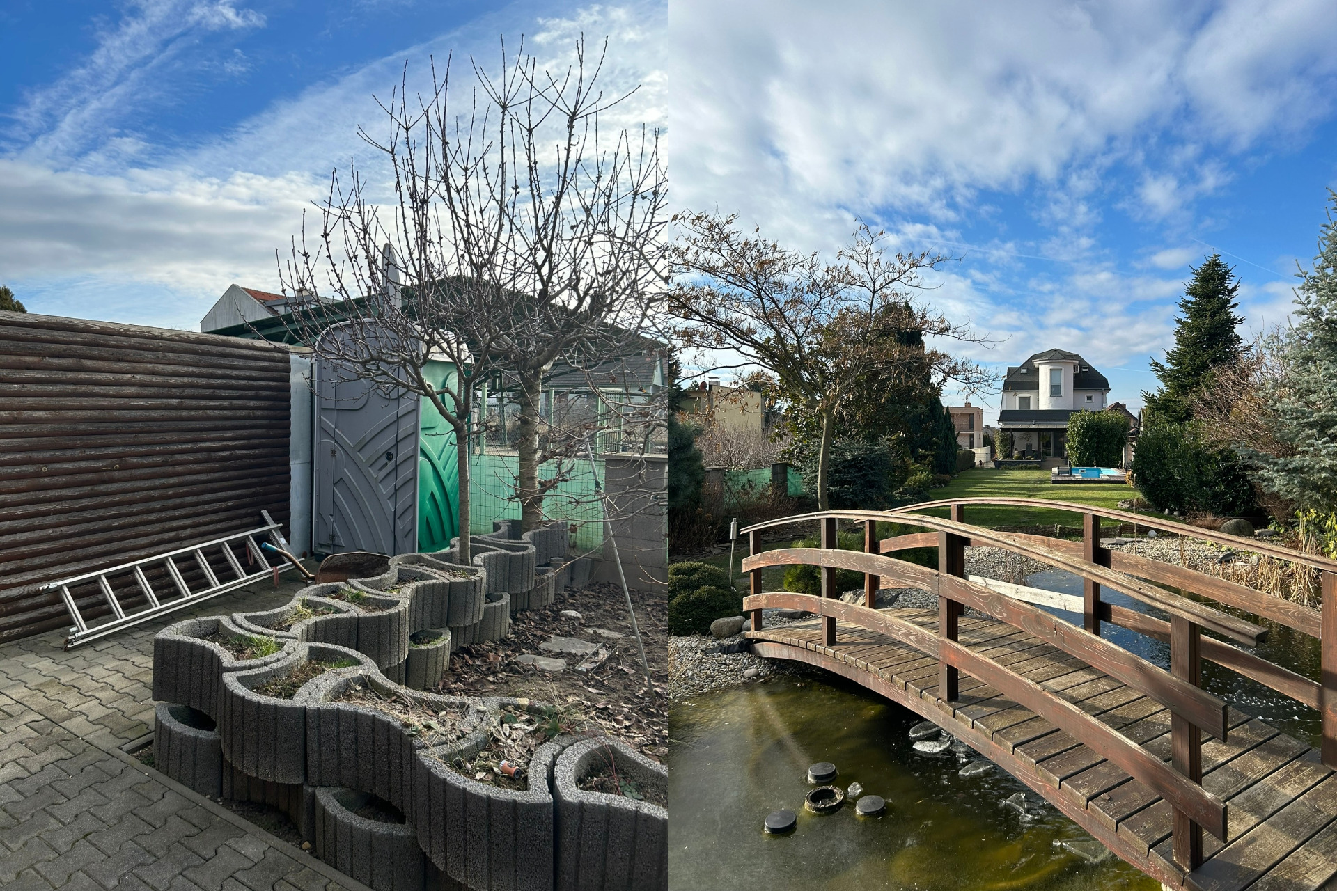 Na pozemku nájdete všetky inžinierske siete: vodovod, kanalizácia, plyn, elektrika. V záhrade sú okrasné stromčeky, jazierko, automatický závlahový systém a bazén s chladením a kúrením pomocou tepelného čerpadla. V prednej časti je parkovanie pre šesť áut. 🚗