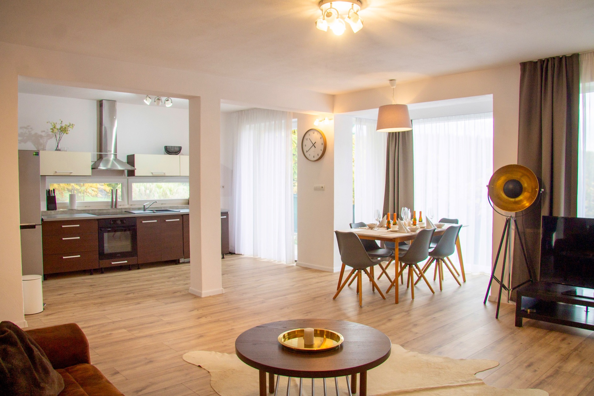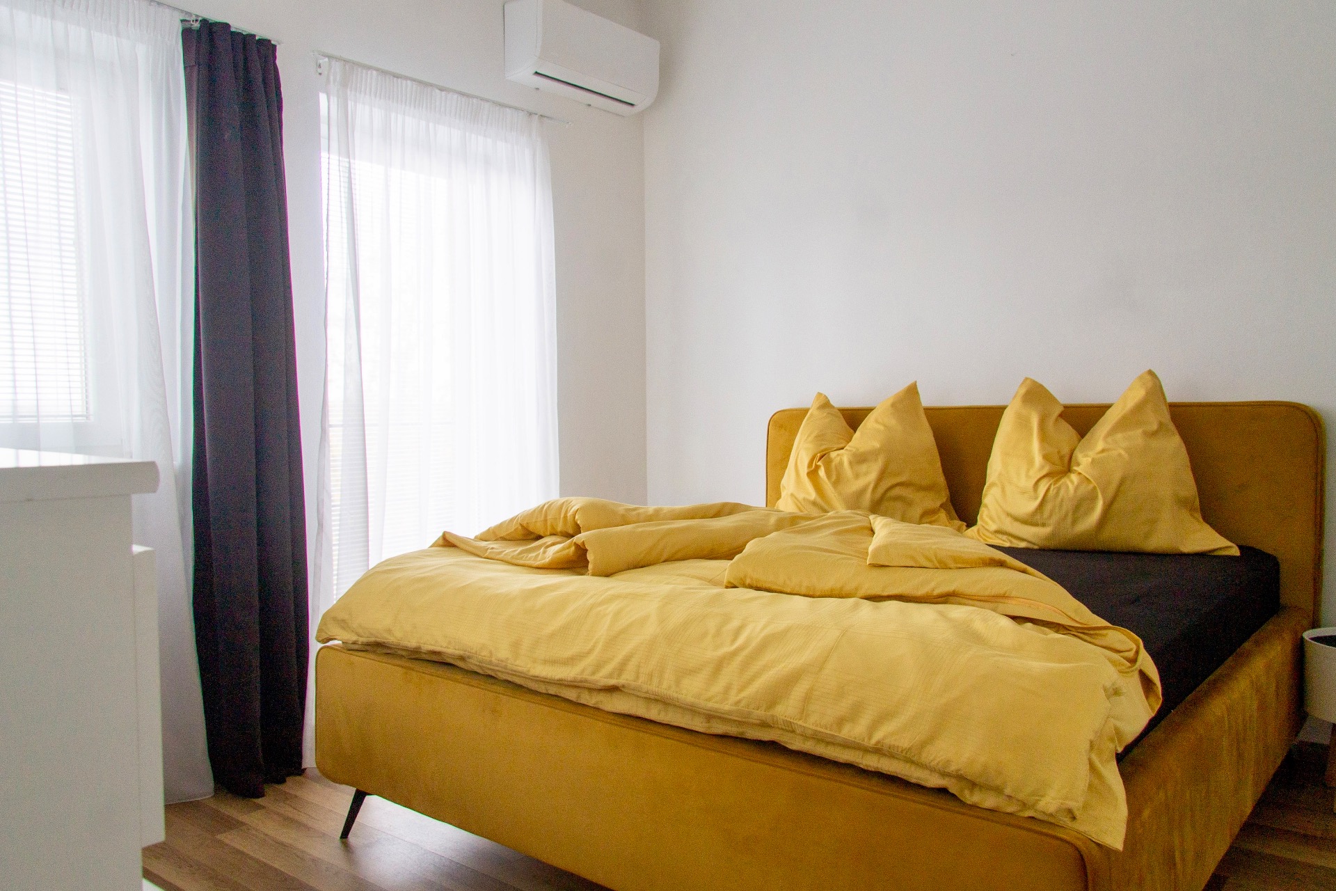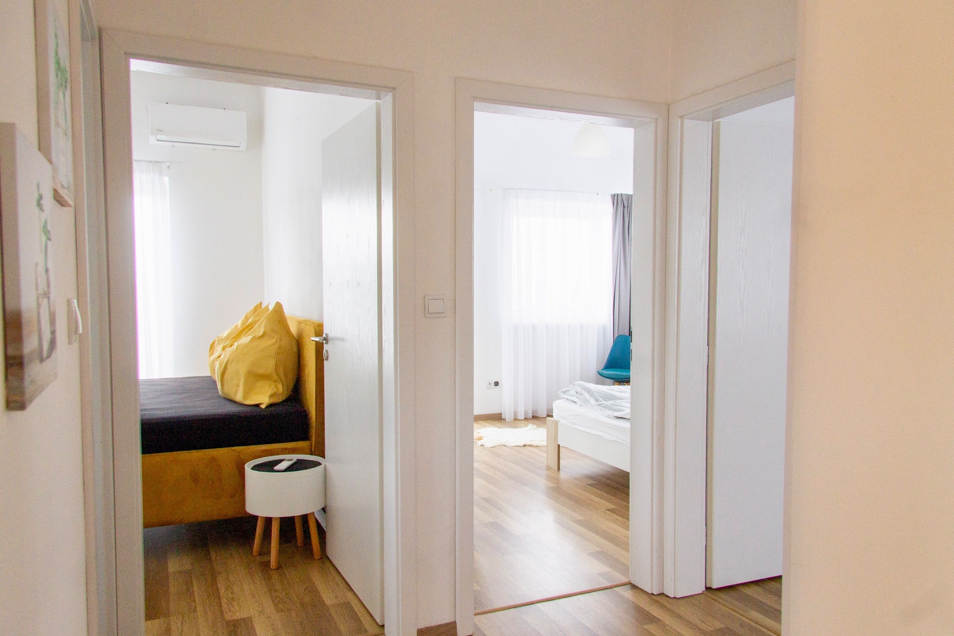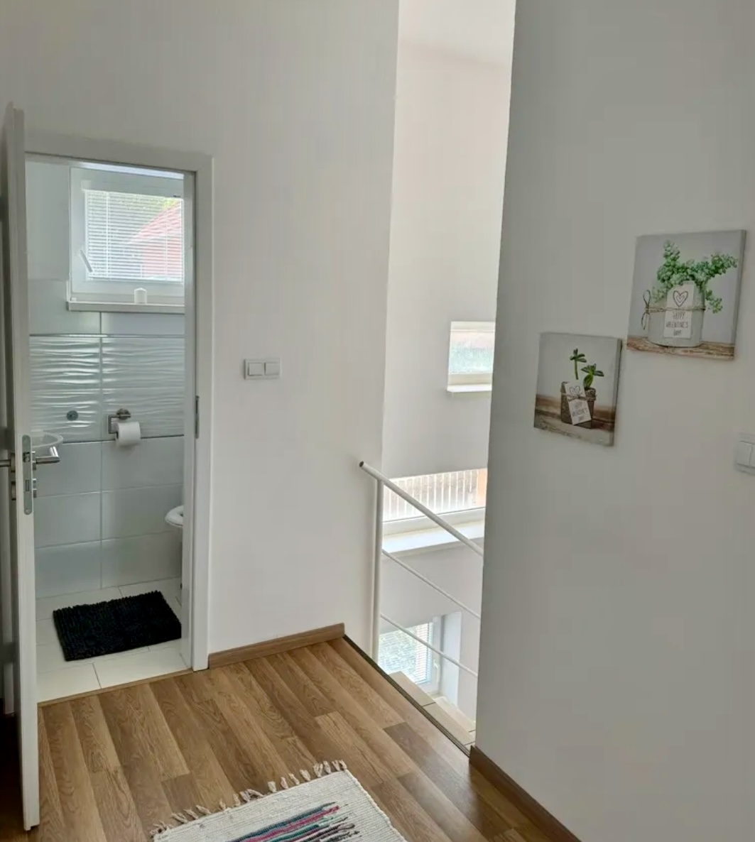 - Poschodie: 3 samostatné izby, kúpeľňa s vaňou a WC, balkón (20 m²), 2× klimatizácia.